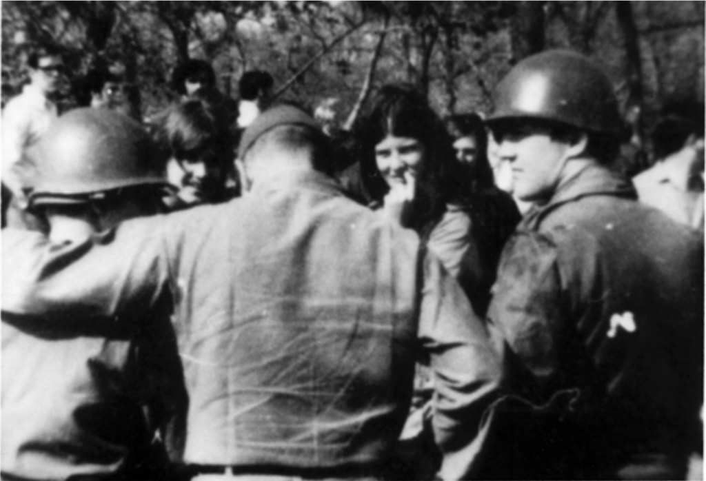Allison with Ohio National Guardsmen discussing peace on May 4, 1970.